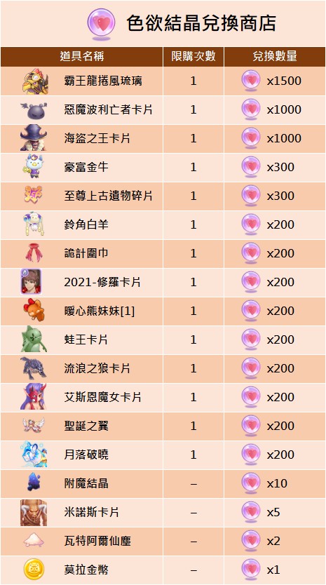 - 【色欲結晶】為永久兌換道具,無兌換時效之限制