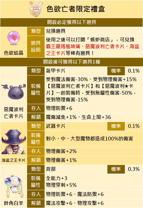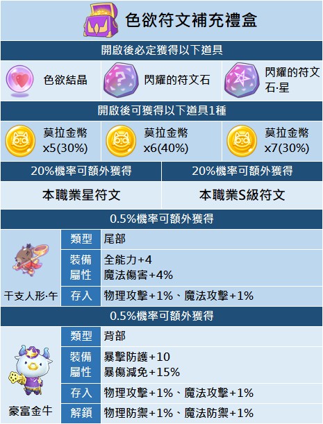 - 「色欲符文補充禮盒」只有二轉及以上職業才能使用禮盒(僅限禮盒上架期間,版本已開放職業適用)