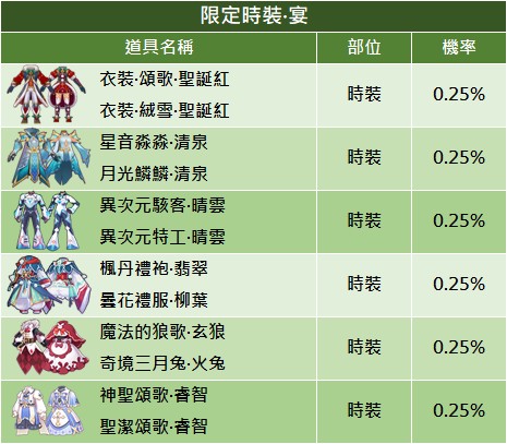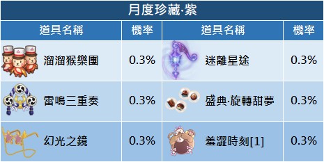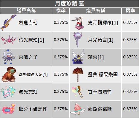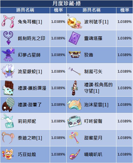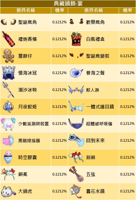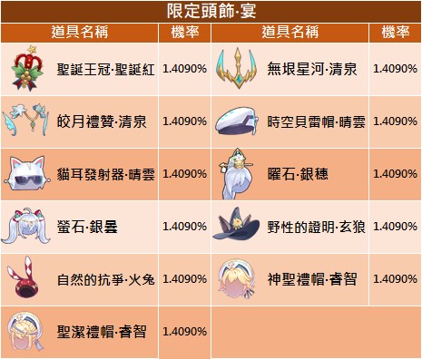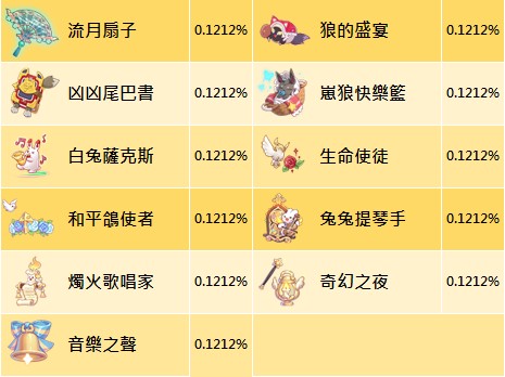- 公告顯示機率為初始機率,每次扭蛋機率會隨已解鎖頭飾而變動,當下實際機率以遊戲內顯示為主