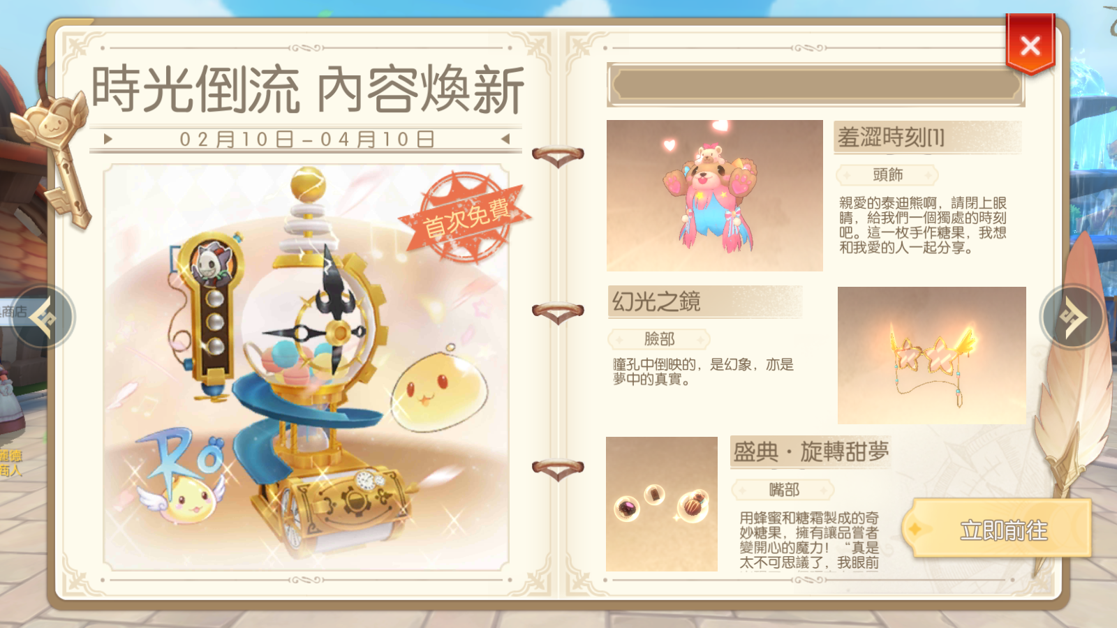 - 使用B格貓金幣、拾光邀請函啟動「拾光許願機」,將會獲得圖鑑中”未解鎖”的頭飾或時裝(依角色性別給予對應的男/女時裝)