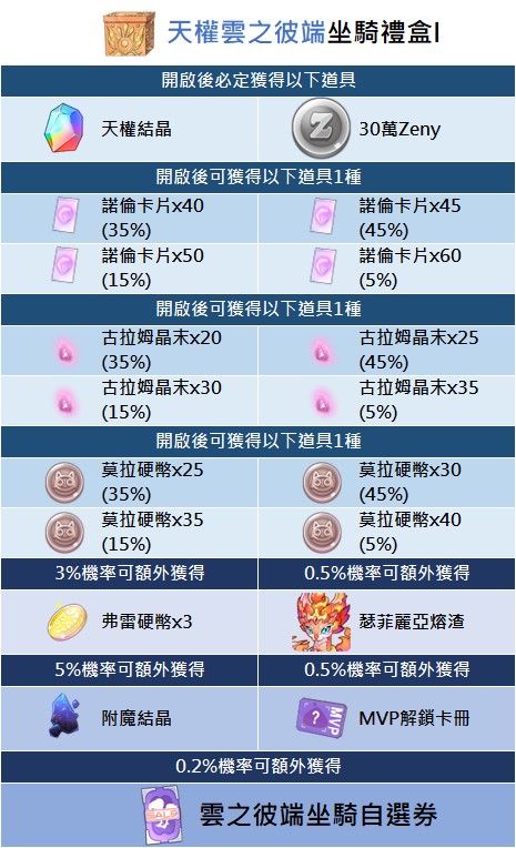 - 「天權雲之彼端坐騎禮盒Ⅰ」售價30B格貓金幣(帳號限購60個)