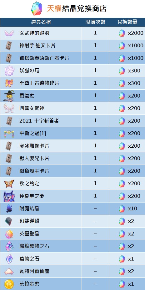 - 【天權結晶】為永久兌換道具,無兌換時效之限制