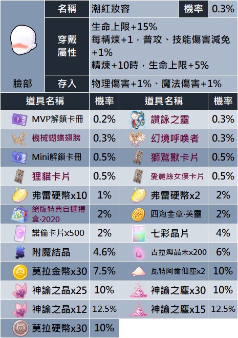 - 部分道具產出機率請參閱相關公告說明:《RO仙境傳說:守護永恆的愛》道具產出機率表
