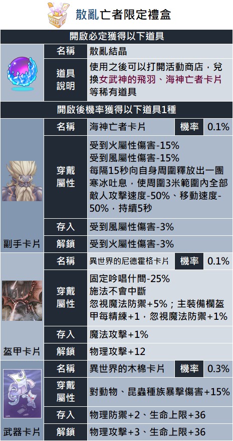 - 「散亂亡者限定禮盒」所獲得的卡片可在冒險手冊解鎖