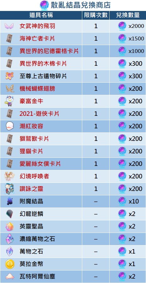 - 【散亂結晶】為永久兌換道具,無兌換時效之限制