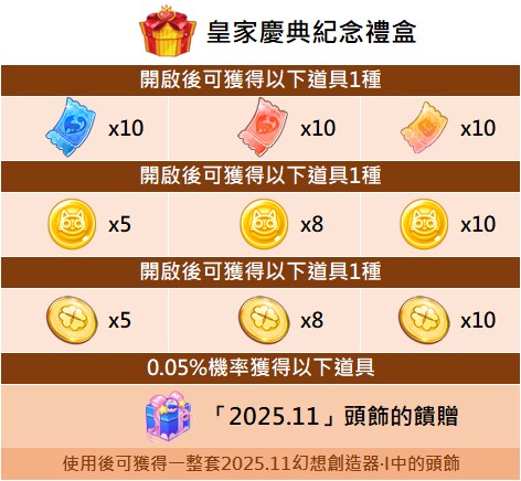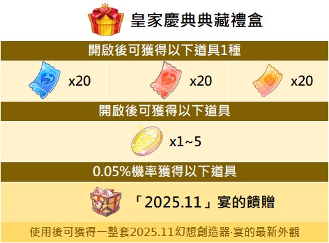 - 打開「慶典驚趣寶箱」,冒險者將隨機變身一種魔物,並獲得「皇家慶典紀念禮盒」x1、「寶箱碎片」x1 👉帳號每日限開啟1個