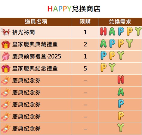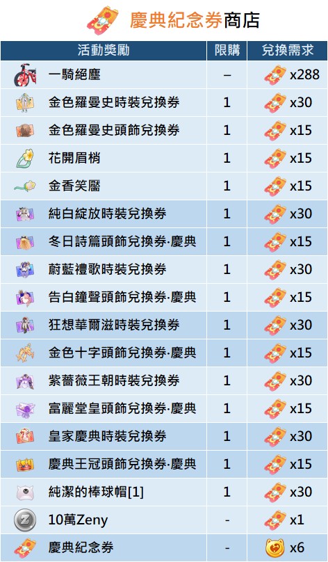 - 冒險者通過完成「皇家慶典」各項活動,或金幣商城購買可以獲得「慶典紀念券」兌換道具,可選擇兌換商店內任一獎勵