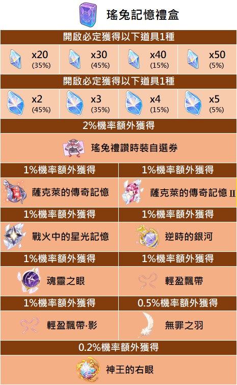 - 部分貴重獎勵,如飾品及坐騎不會額外彈窗提示,每次開啟禮包請玩家確認遊戲內系統顯示為主