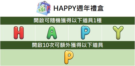 - 活動期間,野外所有魔物均有機率掉落「HAPPY週年禮盒」👉帳號每日獲得上限1個