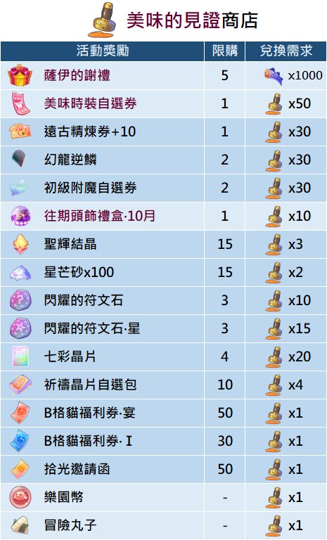 - 冒險者通過完成「黃金美食節」各項活動,可以獲得「美味的見證」、「幽藍尾鰭」等兌換道具,可選擇兌換商店內任一獎勵