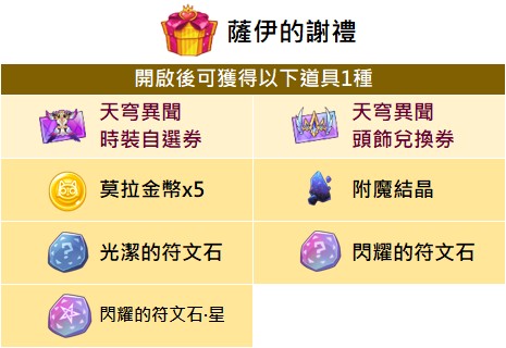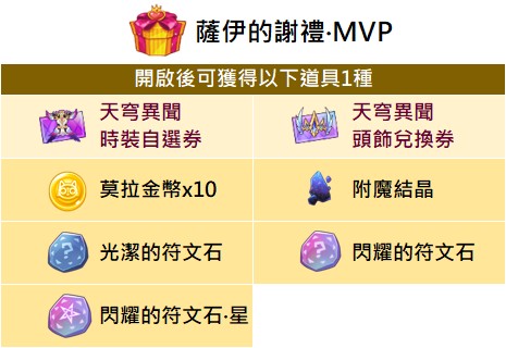 📌【薩伊的謝禮‧MVP】累計開啟3次必定獲得「天穹異聞頭飾兌換券」