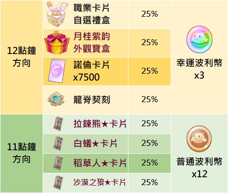 - 當轉到「已獲得」獎勵時,不會獲得該獎勵,而是獲得該格的「替換獎勵」,並且結束本輪轉盤,轉盤將免費自動重置盤面