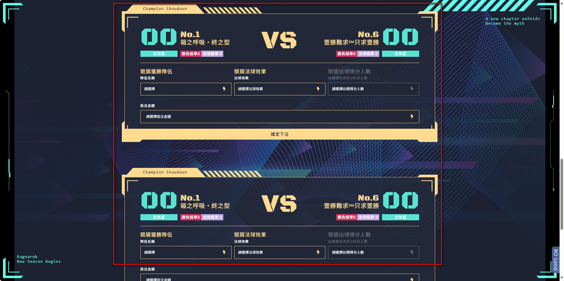 1.『A隊伍』VS『 B隊伍』時,每1局冒險者可先選擇下注500競猜幣A隊伍獲勝後,可再次下注競猜【競猜法球效果/競猜佔領得分人數】,此玩法可下注2次,可選擇【A隊伍、藍+紅】消耗500競猜幣,【B隊伍、紅+黃】消耗500競猜幣,一局對戰最多可下注1500競猜幣。