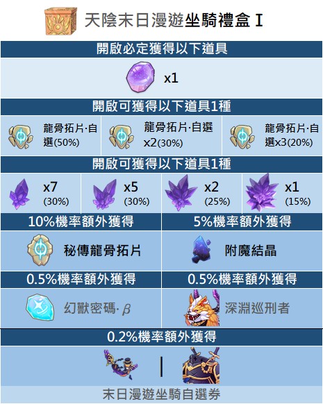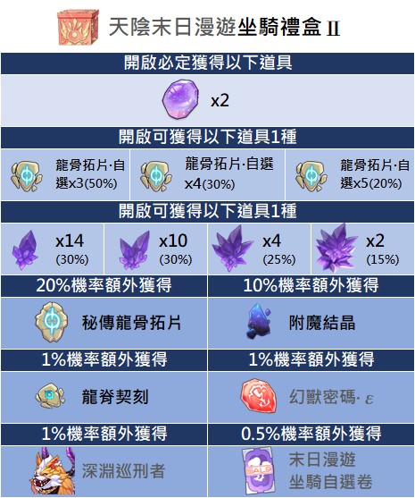 - 部分貴重獎勵,如飾品及坐騎不會額外彈窗提示,每次開啟禮包請玩家確認遊戲內系統顯示為主