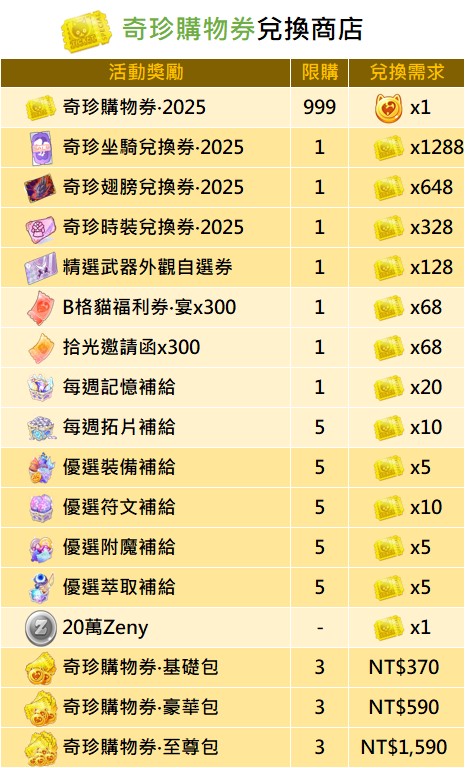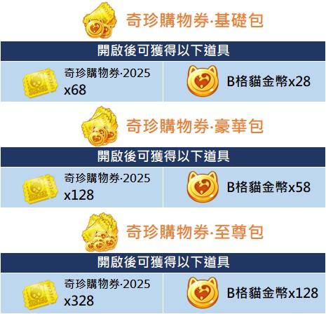 - 冒險者通過「普隆德拉購物節活動」、「購物節禮盒」、「B格貓金幣購買」,可以獲得「奇珍購物券‧2025」,可選擇兌換商店內任一獎勵