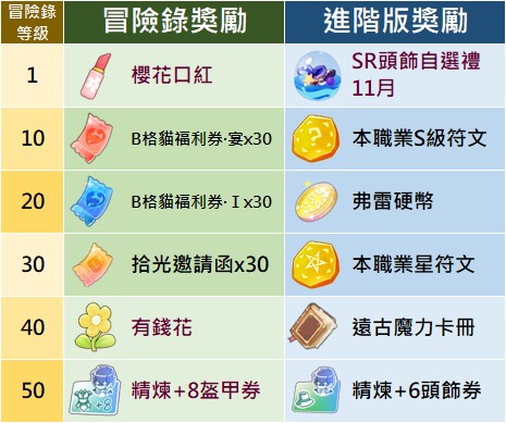 - 可選擇花費 68B格貓金幣 解鎖【冒險錄-進階版】獲得更多活動獎勵!
