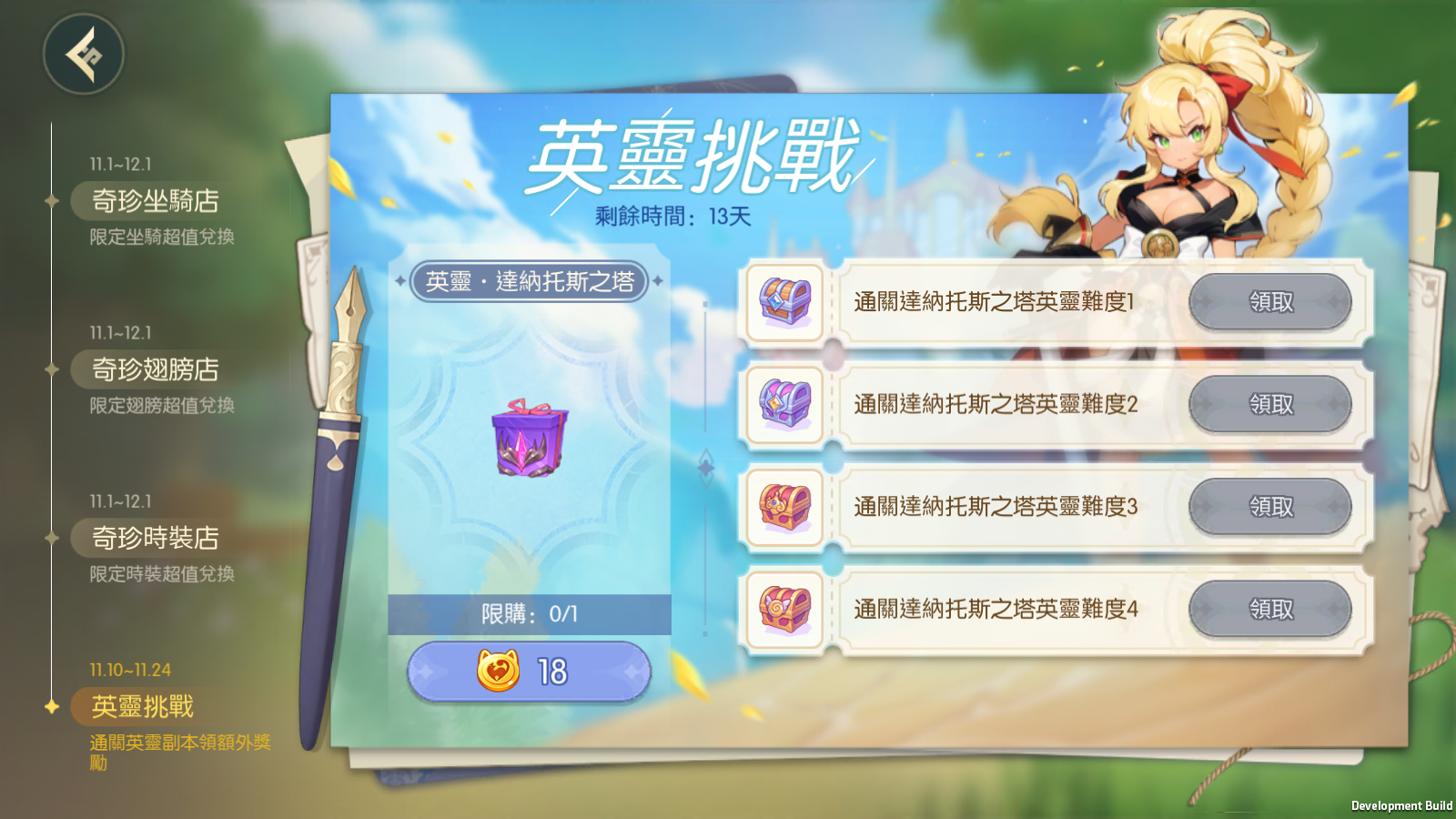 - 活動期間,活動介面將特惠出售「英靈‧達納托斯之塔」禮盒,售價18B格貓金幣 👉每個帳號限購1次