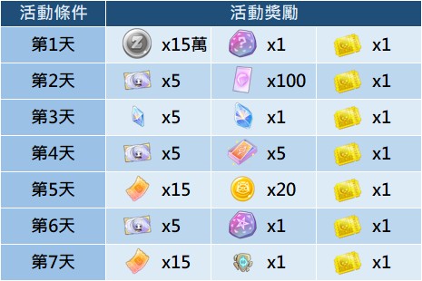 - 累計登錄活動指定天數,即可獲得對應獎勵