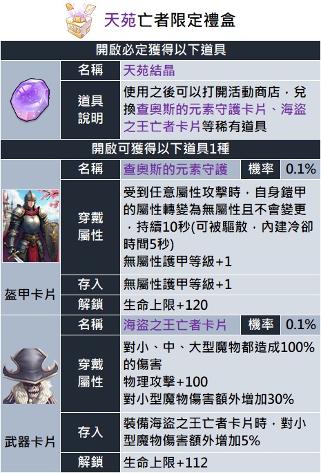- 「天苑亡者限定禮盒」所獲得的卡片可在冒險手冊解鎖