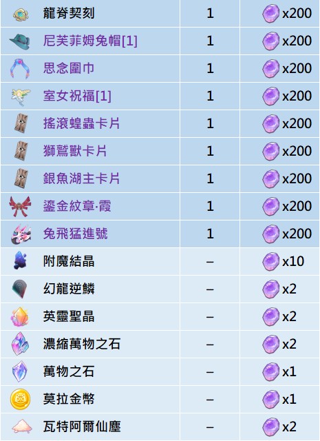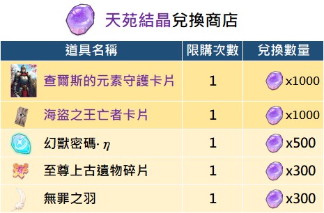 - 【天苑結晶】為永久兌換道具,無兌換時效之限制