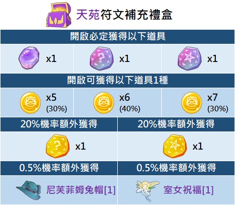 | 天苑符文補充禮盒 | 30B格貓金幣 | 300個 |
