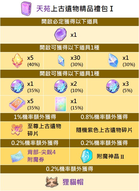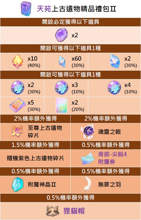 - 部分貴重獎勵,如飾品及坐騎不會額外彈窗提示,每次開啟禮包請玩家確認遊戲內系統顯示為主