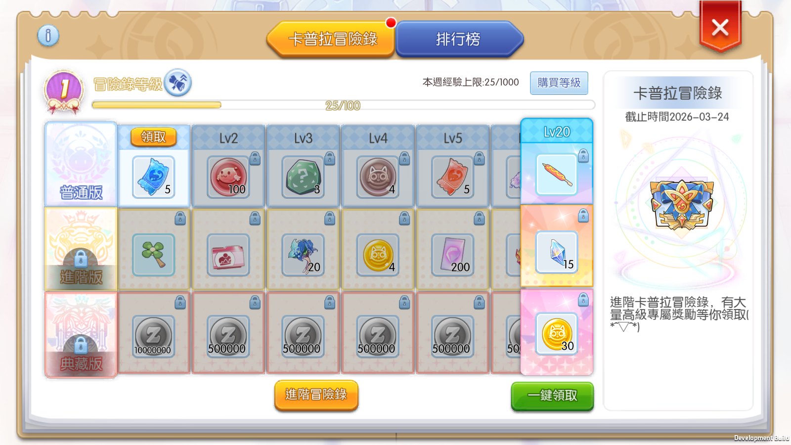 3、冒險者可以通過完成冒險錄的日常/週常任務來獲取經驗,升級冒險錄逐步解鎖獎勵