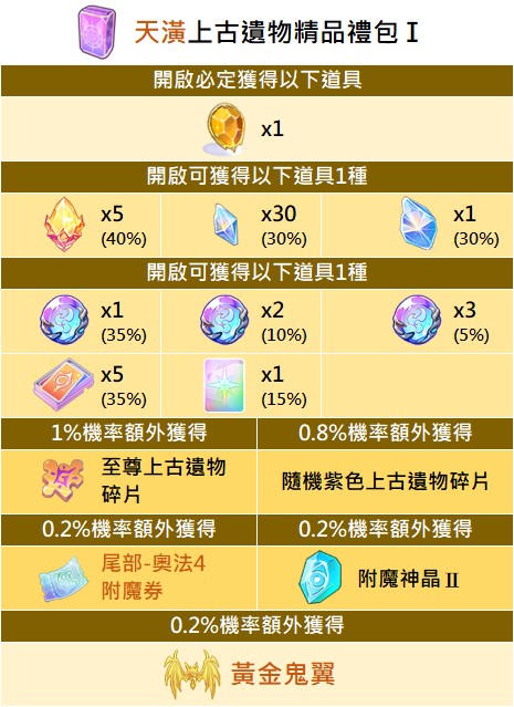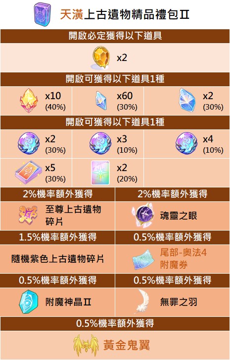 - 部分貴重獎勵,如飾品及坐騎不會額外彈窗提示,每次開啟禮包請玩家確認遊戲內系統顯示為主
