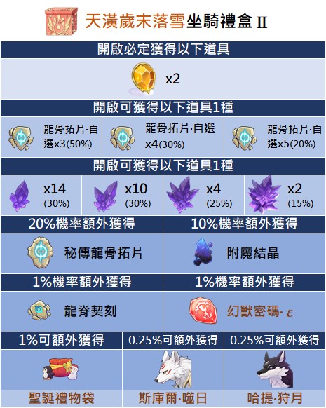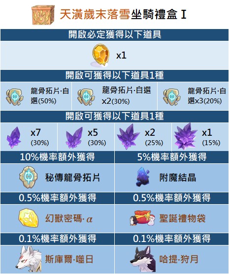 - 部分貴重獎勵,如飾品及坐騎不會額外彈窗提示,每次開啟禮包請玩家確認遊戲內系統顯示為主