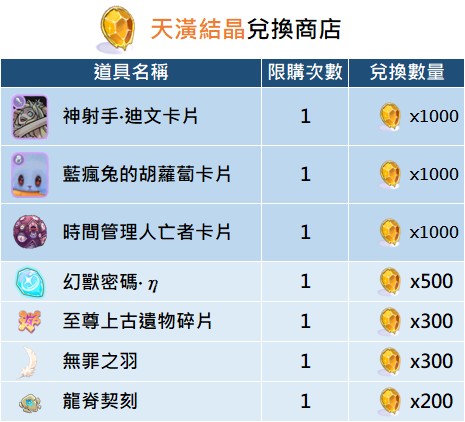 - 【天潢結晶】為永久兌換道具,無兌換時效之限制