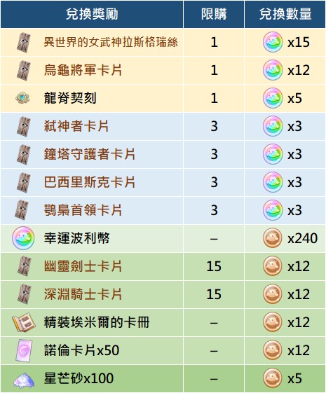 - 每次完成捐獻可獲得:「料理兌換券」x1、「墜星隕鐵」x1、「波利成長秘藥」x1、「B格貓福利券‧宴」x3