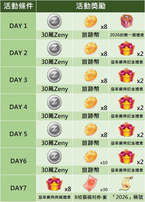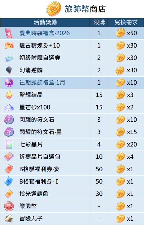 - 冒險者通過完成「皇家慶典」各項活動,可以獲得「慶典紀念幣」、可選擇兌換商店內任一獎勵