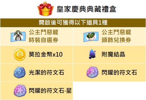 【皇家慶典典藏禮盒】累計開啟3次必定獲得「公主鬥惡龍頭飾兌換券」