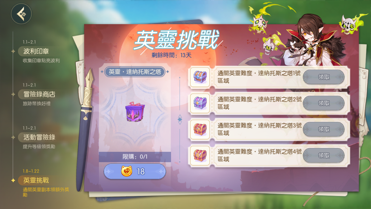 - 活動期間,活動介面將特惠出售「英靈‧達納托斯之塔」禮盒,售價18B格貓金幣 👉每個帳號限購1次