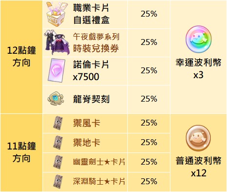- 當轉到「已獲得」獎勵時,不會獲得該獎勵,而是獲得該格的「替換獎勵」,並且結束本輪轉盤,轉盤將免費自動重置盤面