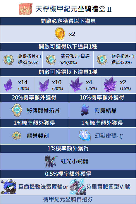 - 部分貴重獎勵,如飾品及坐騎不會額外彈窗提示,每次開啟禮包請玩家確認遊戲內系統顯示為主