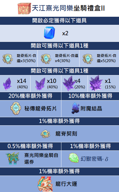- 部分貴重獎勵,如飾品及坐騎不會額外彈窗提示,每次開啟禮包請玩家確認遊戲內系統顯示為主