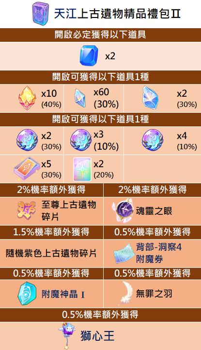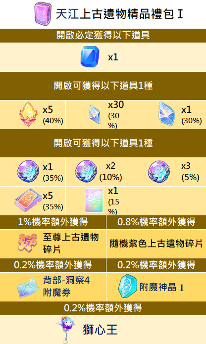 - 部分貴重獎勵,如飾品及坐騎不會額外彈窗提示,每次開啟禮包請玩家確認遊戲內系統顯示為主