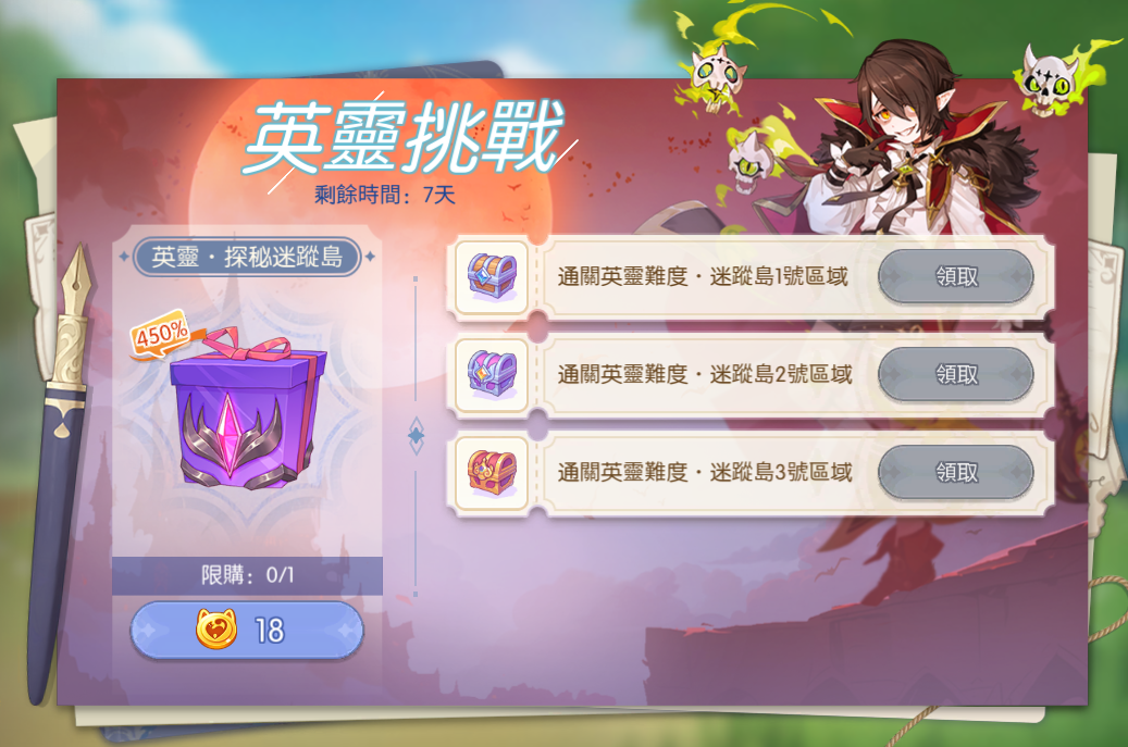 - 活動期間,活動介面將特惠出售「英靈‧探秘迷蹤島」禮盒,售價18B格貓金幣 👉每個帳號限購1次