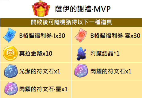 📌【薩伊的謝禮‧MVP】累計開啟3次必定獲得「B格貓福利券‧Ix30」