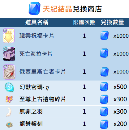 - 【天紀結晶】為永久兌換道具,無兌換時效之限制